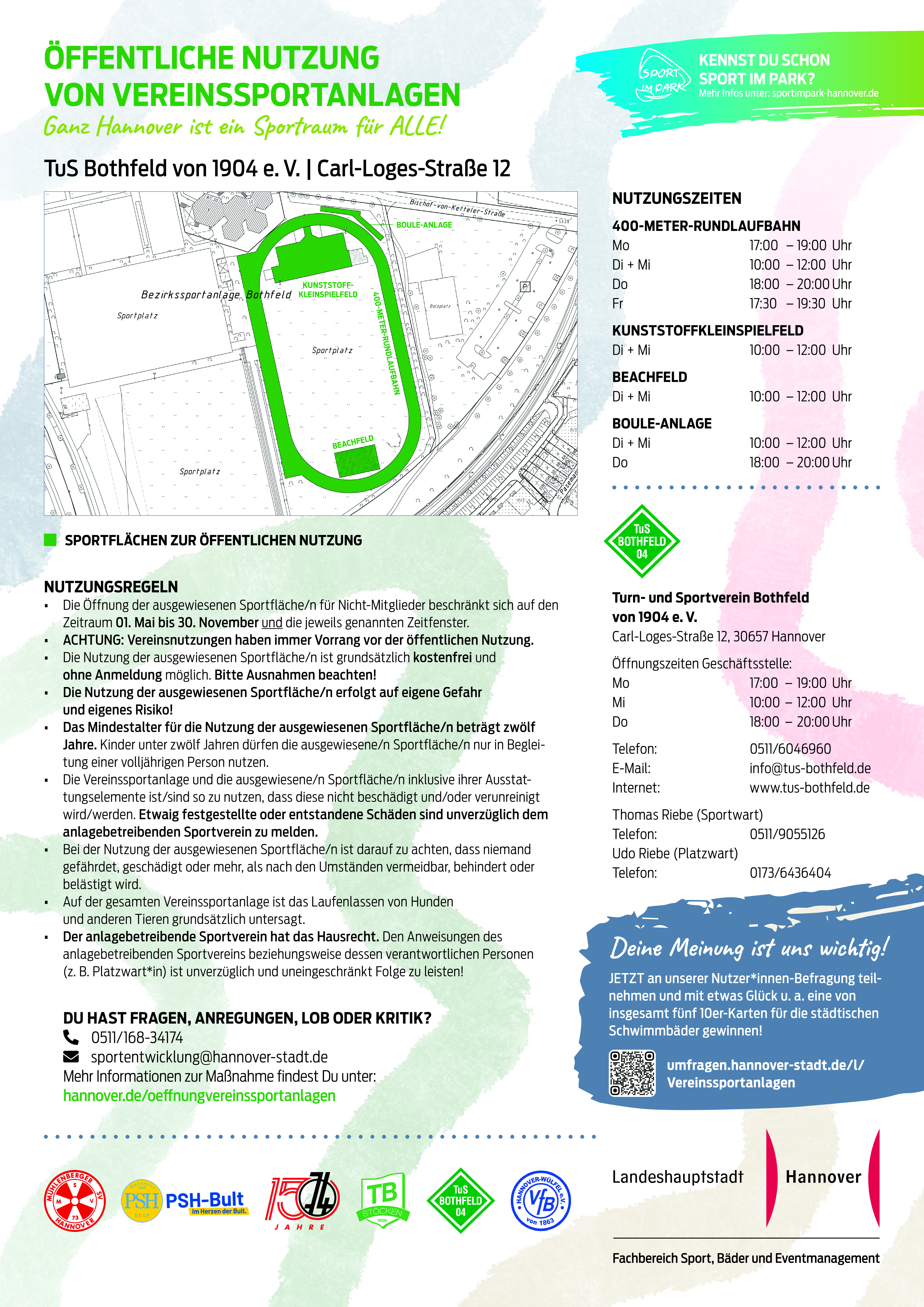 | Jugendliche U14 | 2012, 2013 | Fr. | 17:00 - 19:00 Uhr | Sportplatz TuS Bothfeld 04 (Carl-Loges-Str. 12) | Vera |